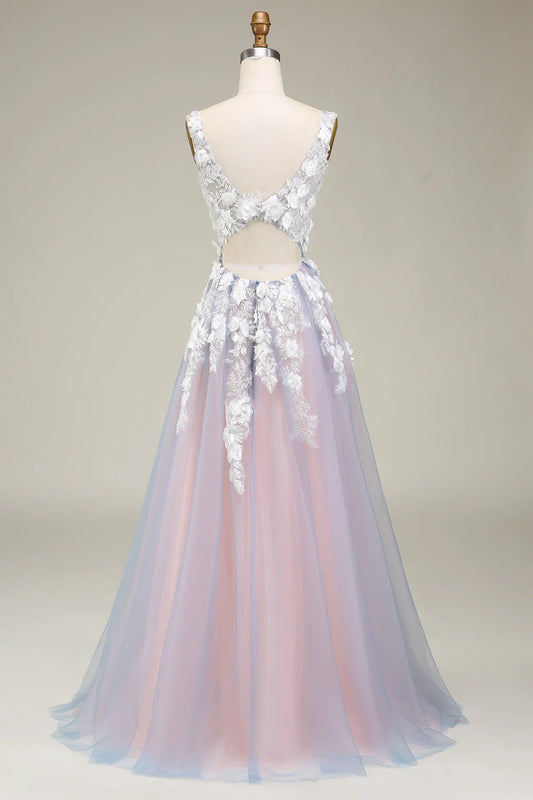 Amzcw Gorgeous Grey Pink A Line Deep V Neck Long Prom Dress with Appliques prom dresses with long sleeves
