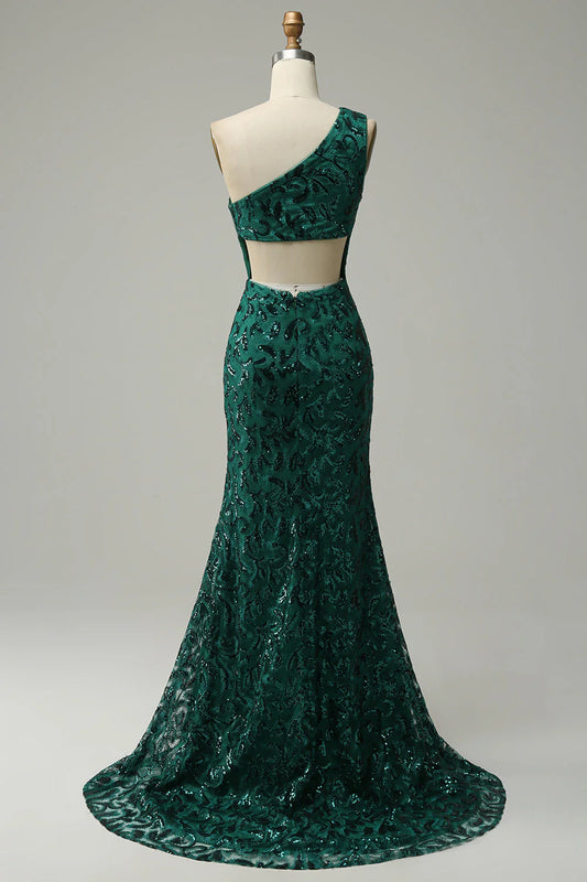Amzcw Dark Green Mermaid One Shoulder Sequins Long Prom Dress with Split Front prom dresses with long sleeves