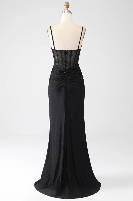 Amzcw Mermaid Spaghetti Straps Pleated Long Black Prom Dress with Beading