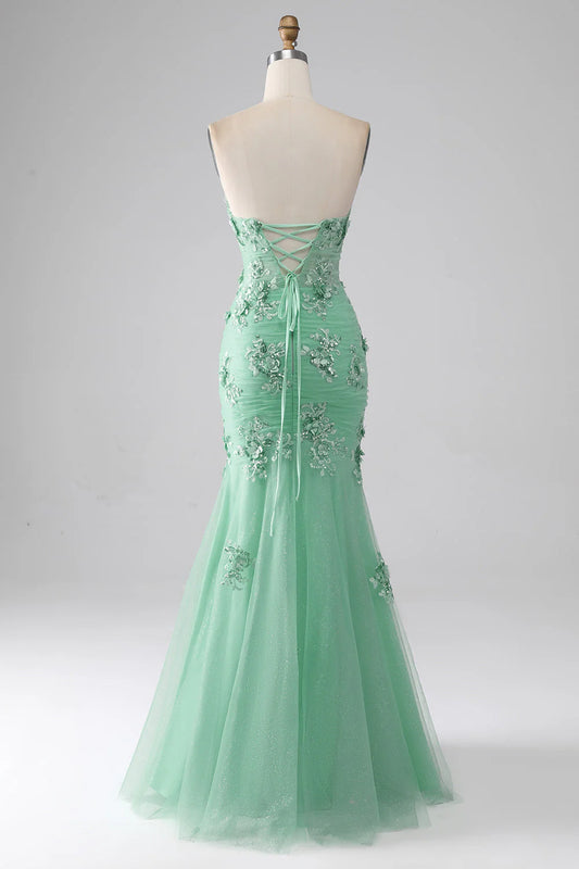 Amzcw Green Mermaid Strapless Tulle Long Prom Dress with Appliques