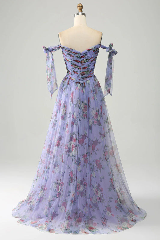Amzcw Lavender A-Line Off The Shoulder Floral Print Pleated Tulle Prom Dress