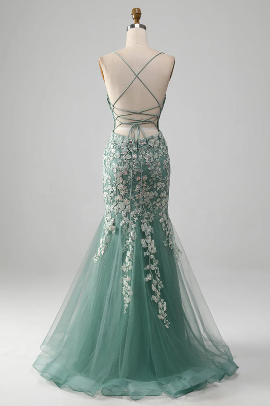 Amzcw Light Green Mermaid Lace-Up Back Tulle Prom Dress with Appliques prom dresses with long sleeves