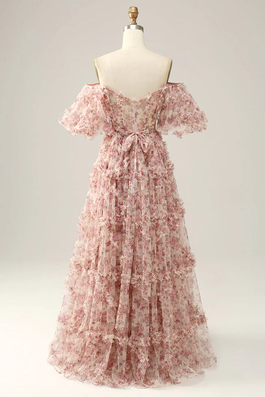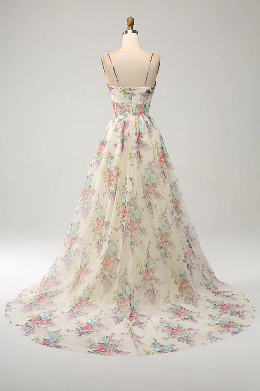 Amzcw Ivory A-Line Spaghetti Straps Flower Printed Prom Dress with Slit