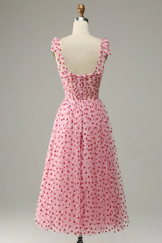 Amzcw Pink A-line Square Neck Tulle Midi Dress with Hearts