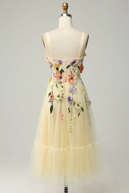 Amzcw Champagne A Line Spaghetti Straps Tea Length Wedding Party Dress with Appliques
