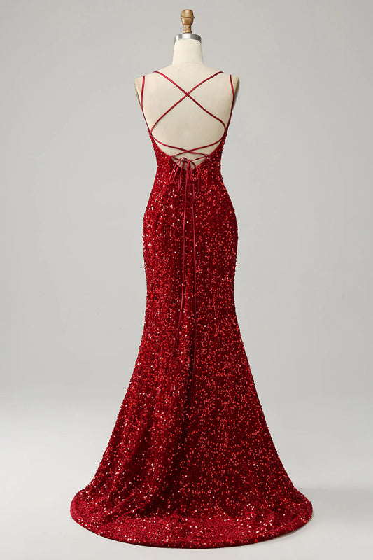 Amzcw Red Sparkly Mermaid Spaghetti Straps Backless Prom Dress with Fringes