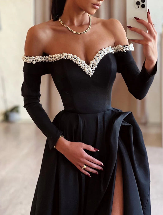 A-Line Evening Gown Black Dress Dress Formal Masquerade Sweep / Brush Train Long Sleeve Off Shoulder Satin with Pearls Slit