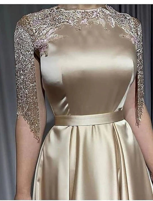 A-Line Evening Gown Elegant Dress Masquerade Black Tie Floor Length Short Sleeve High Neck The Great Gatsby Satin with Fringe Tassel Appliques