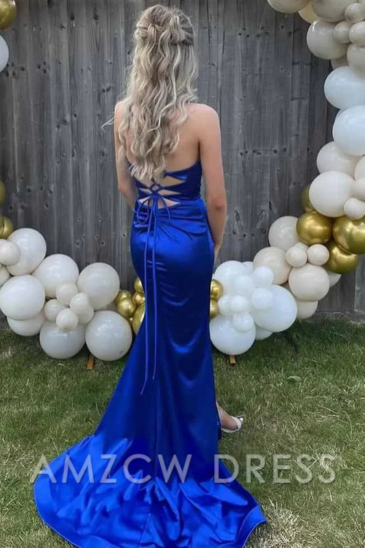 Amzcw Mermaid Strapless Royal Blue V-Neck Sleeveless Satin Long Prom Dress formal wear dresses