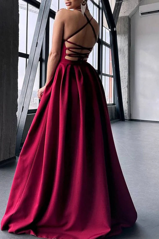 Amzcw Red Spaghetti Straps V-Neck Satin Long Prom Dress with Slit formal wear dresses