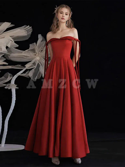 Amzcw A-Line Off Shoulder Satin Burgundy Long Prom Dress Burgundy Long Formal Dress prom dress in store