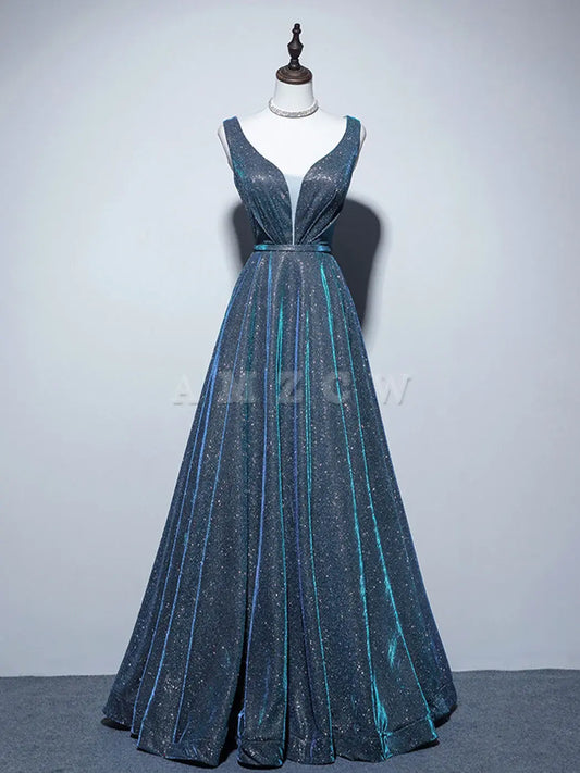 Amzcw A-Line V Neck Satin Blue Long Prom Dress Blue Formal Dresses prom dress in store