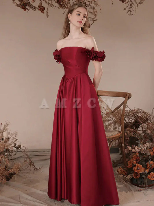 Amzcw Burgundy A-Line Off Shoulder Satin Long Prom Dress Burgundy Formal Evening Dress prom dress in store