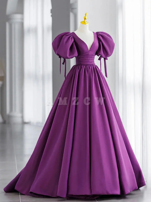 Amzcw Purple V Neck Satin Long Prom Dresses Purple Evening Dresses prom dress in store
