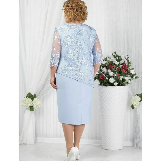 Elegant Blue Plus Size Scoop Half Sleeve Lace Spandex Layered Knee Length Mother Of The Bride Dress