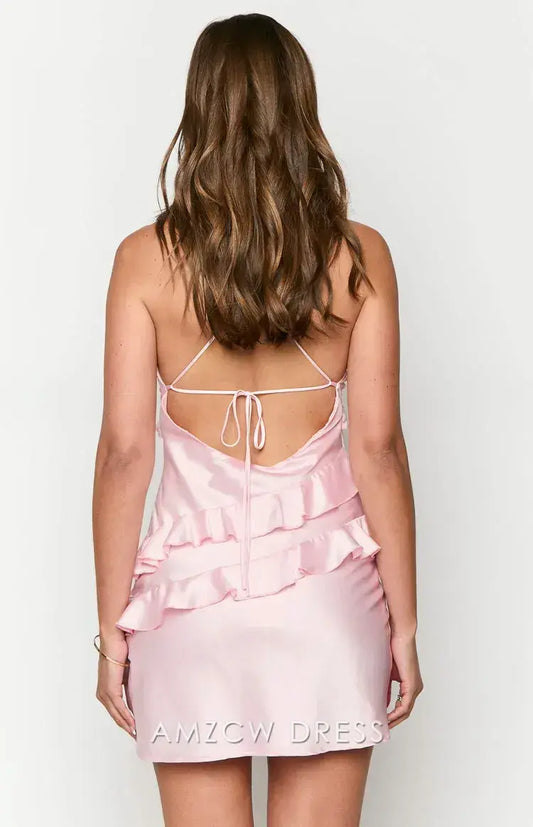 Amzcw Elegantes Vestidos de Fiesta de Homecoming Línea A Mini Vestido de Satén Rosa Corto Venta Caliente para Mujeres