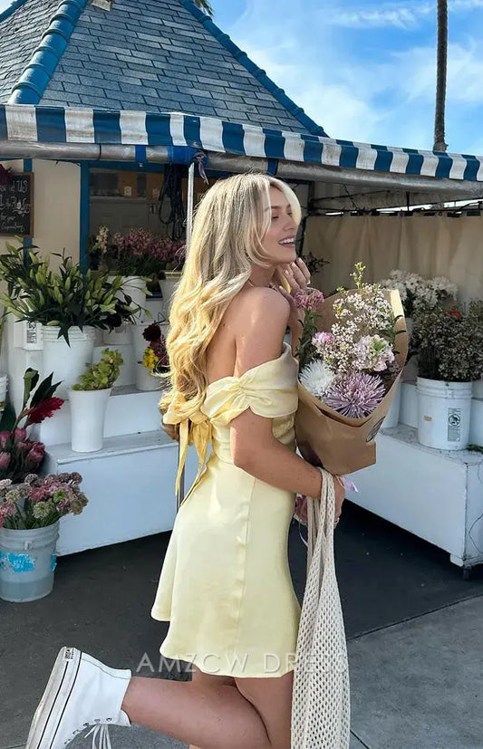 Amzcw - Elegante vestido de fiesta de bienvenida, corte A, amarillo prímula, satén, hombros descubiertos, minivestido corto, gran oferta para mujer