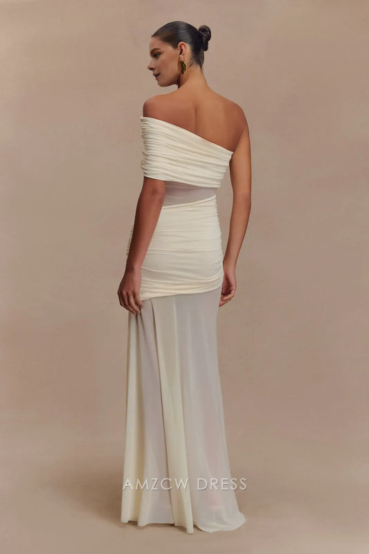 Vestido largo elegante de fiesta Amzcw de malla con un solo hombro, color marfil, largo hasta el suelo, formal, gran oferta para mujer.