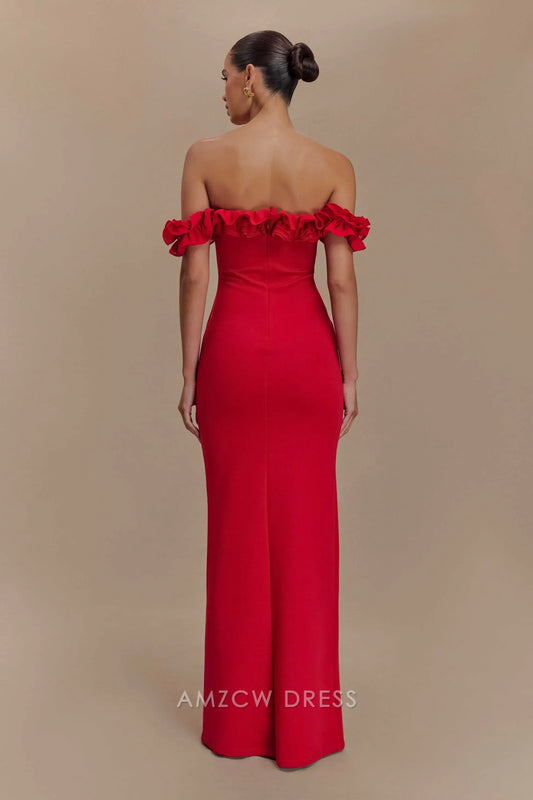 Vestido largo elegante Amzcw con volantes y hombros descubiertos para fiesta de graduación - Rubí, largo hasta el suelo, formal, gran oferta para mujer
