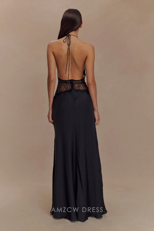 Vestido largo elegante de encaje y satén Amzcw para fiesta de graduación, largo hasta el suelo, color negro, ideal para mujer.