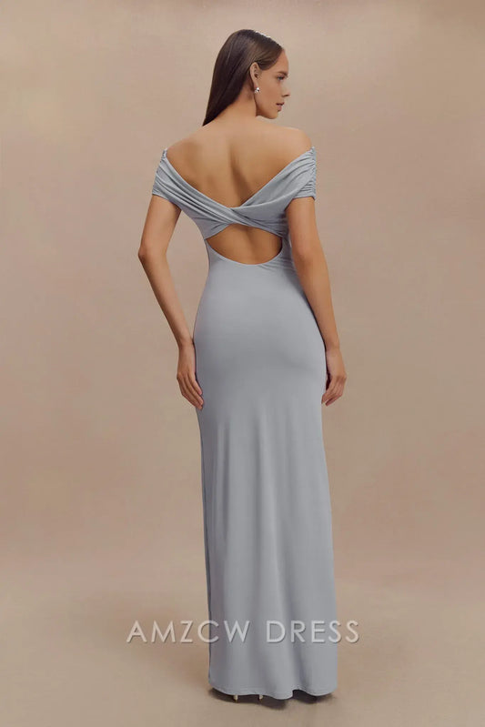 Elegante vestido de fiesta Amzcw, con hombros descubiertos y corte ceñido, largo hasta el suelo, en azul polvoriento, ideal para mujer.