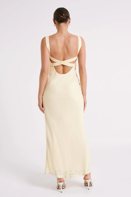 Vestido largo elegante de satén Amzcw para fiesta de graduación, largo hasta el suelo, color amarillo claro, ideal para mujer.