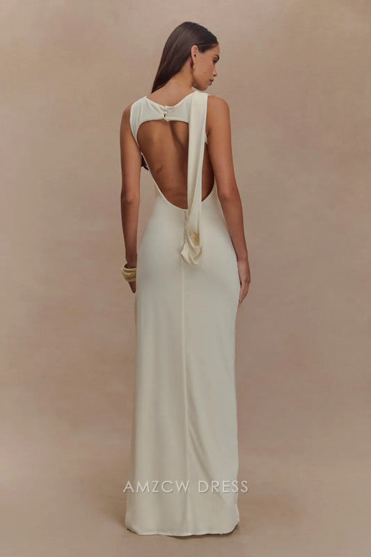 Vestido largo elegante Amzcw para fiesta de graduación, con drapeado ceñido, color marfil, largo hasta el suelo con abertura, ideal para ocasiones formales.