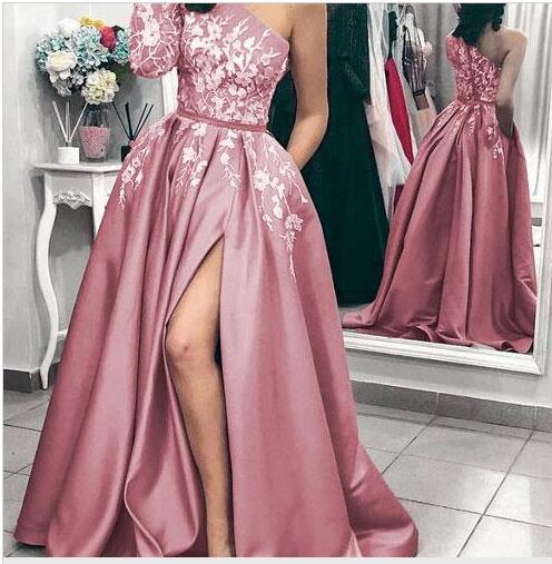 Vestido de fiesta largo de un hombro, manga larga, satén gris, abertura, encaje blanco, con bolsillos