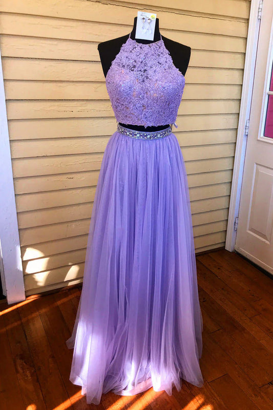 Encantadores vestidos de fiesta de dos piezas con escote halter largo, espalda abierta, fluidos, de tul violeta y cuentas