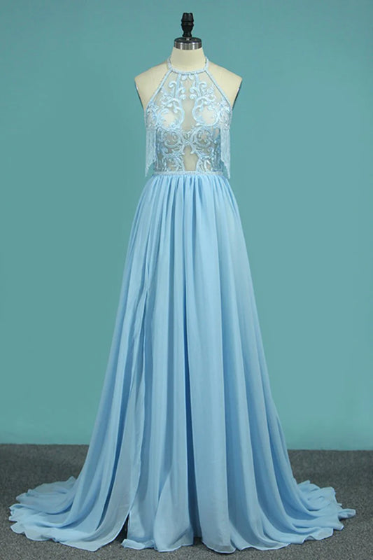 Vestidos de fiesta de gasa con cuello halter, corte en A, apliques y cola larga con abertura