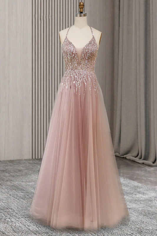 Vestidos de fiesta de tul con escote en V, tirantes finos, cuentas y espalda descubierta con abertura