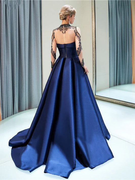Vestidos de fiesta de manga larga Vestido de fiesta largo de cuello alto Vestido de noche de satén