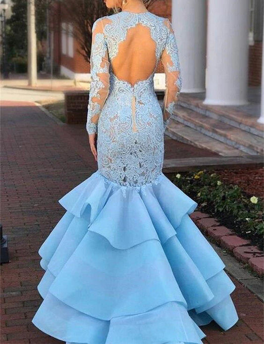 Hermosos vestidos de fiesta de sirena de encaje azul claro con mangas largas y vestidos de noche