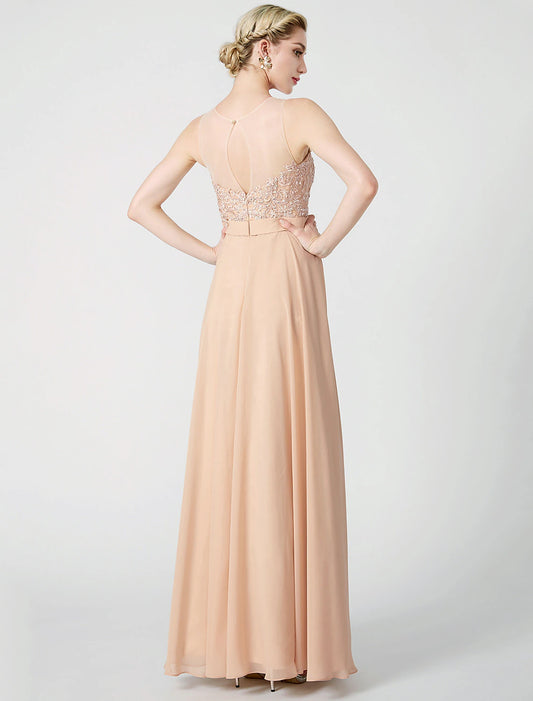 Vestido estilo imperio de corte A para invitada de boda, baile de graduación, largo hasta el suelo, sin mangas, cuello ilusión, vestido de dama de honor de gasa con apliques de cuentas