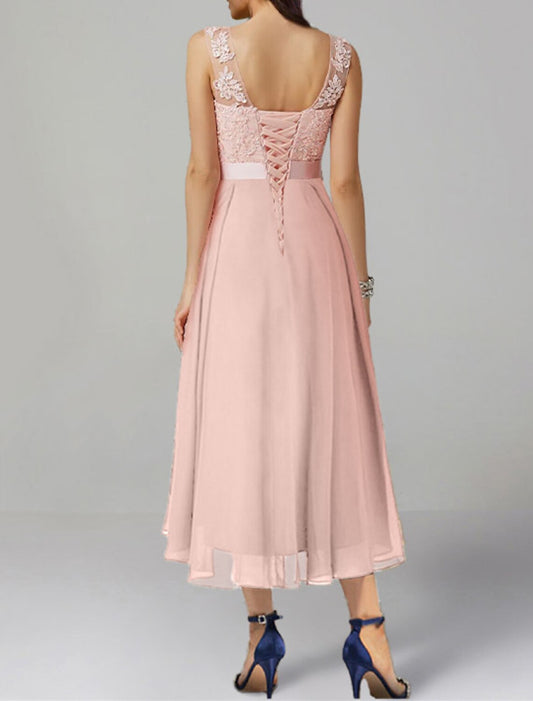 Vestidos de cóctel de corte A, estilo asimétrico, sin mangas, con escote joya, de gasa y apliques.