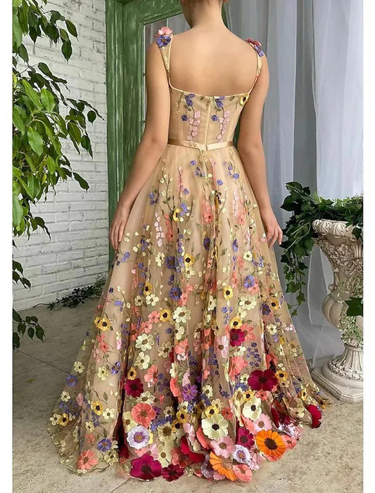 Vestidos de fiesta de corte A, vestido floral, vestido formal para invitados de boda, cola capilla, sin mangas, tirantes finos, tul con apliques