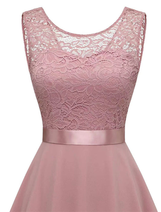 Vestido de fiesta para mujer, vestido de encaje, vestido de regreso a casa, vestido midi, rosa, vino, azul, sin mangas, color puro, encaje, verano, primavera, cuello redondo, fiesta, cumpleaños, fiesta de noche, invitada de boda