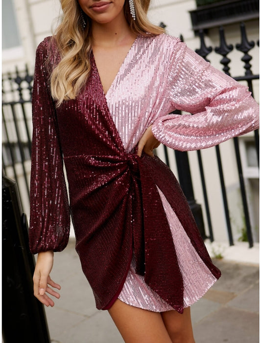 Vestidos de fiesta con corte tubo/columna, brillantes y con brillo, para cumpleaños, otoño, cortos/mini, de manga larga, con escote en V y lentejuelas y tiras.