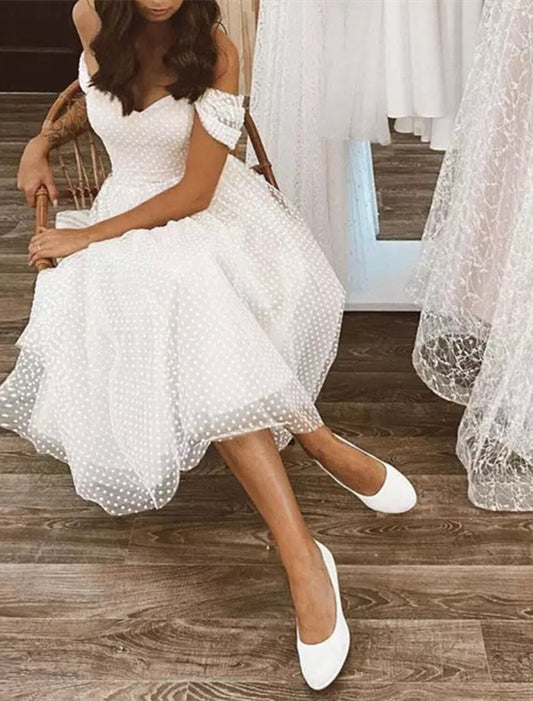 Vestido de fiesta de corte A, sexy, para regreso a casa, graduación, largo hasta la rodilla, manga corta, hombros descubiertos, tul con lunares