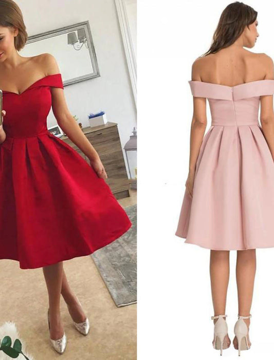 Vestido de cóctel de fiesta sexy vintage de corte A con hombros descubiertos, sin mangas, largo hasta la rodilla, de satén con diseño elegante