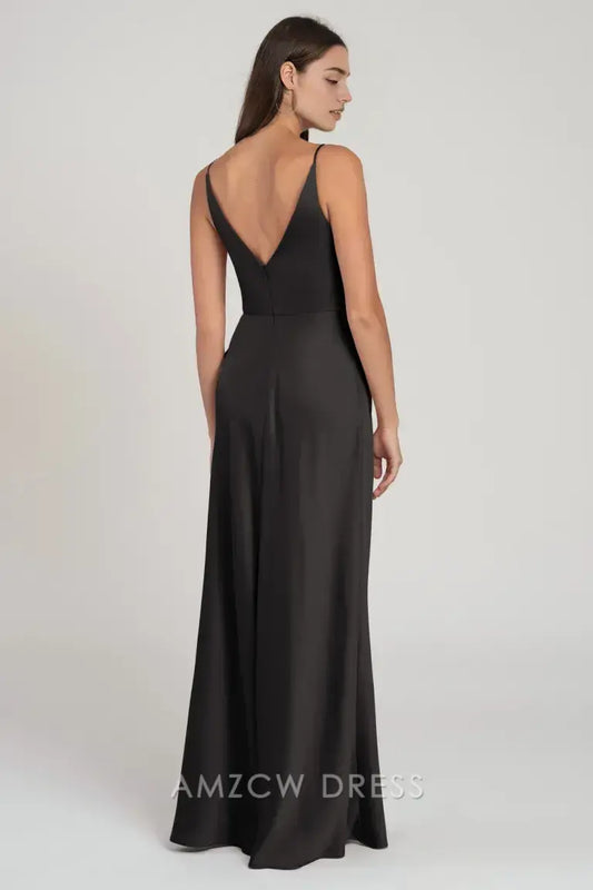 Vestido elegante de satén negro Amzcw con escote en V profundo y tirantes finos, vestido maxi ajustado, vestidos formales