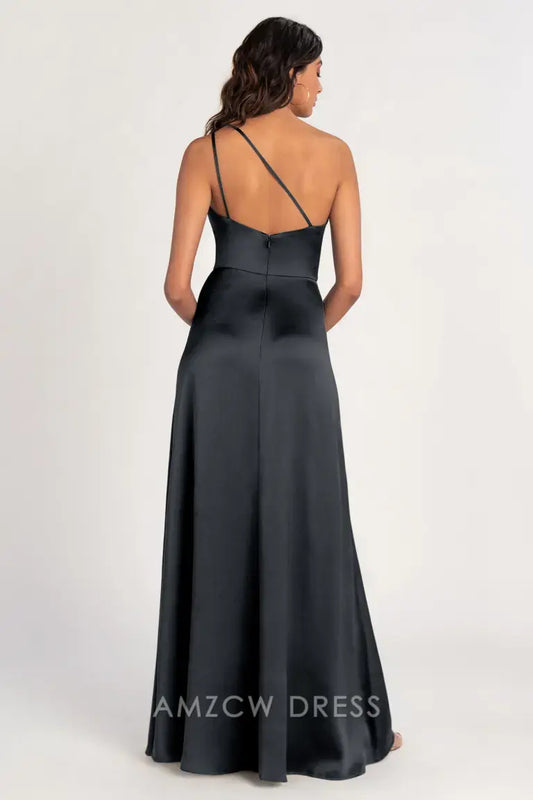 Vestido elegante de satén negro de Amzcw con un solo hombro, corte ajustado y abertura alta, vestidos formales