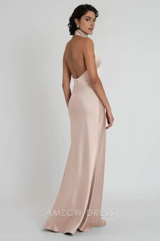 Vestido elegante Amzcw de satén ruborizado con cuello halter - Escote alto, sin mangas, ajustado, maxi vestidos formales