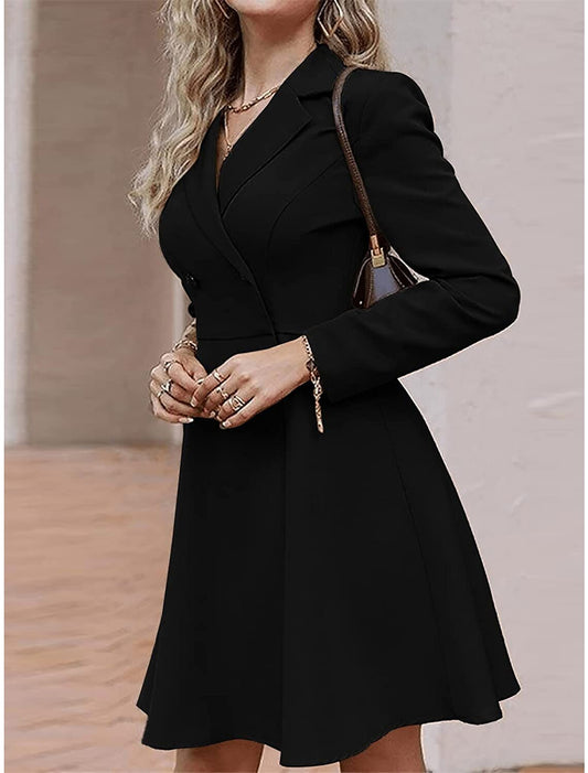 Vestido negro de mujer, vestido de fiesta, vestido de regreso a casa, mini vestido negro azul camel, manga larga, color puro, botones, primavera, otoño e invierno, cuello camisero, vestido de moda de invierno, vestido de oficina para invitadas de boda.