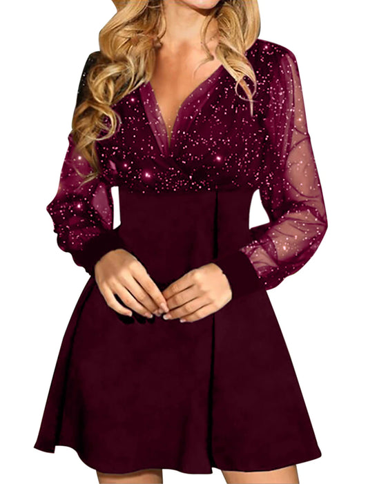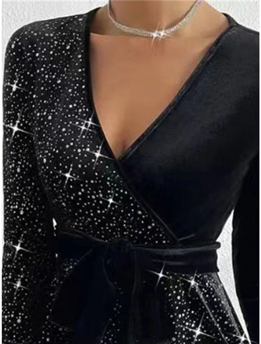 Women‘s Party Dress Sequin Dress Black Dress Velvet Dress Homecoming Dress Mini Dress Long Sleeve Pure Color Beads Fall Winter Autumn V Neck Fashion Winter Dress Wedding Guest Birthday Slim