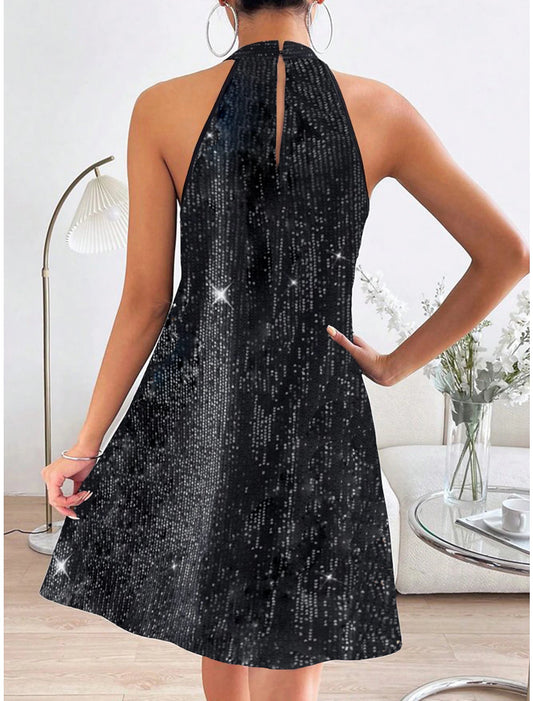 Vestido negro corto sexy para mujer, vestido negro con lentejuelas, vestido de fiesta, vestido de bienvenida, minivestido fucsia sin mangas, cuello halter, moda para invitadas de boda y vacaciones.