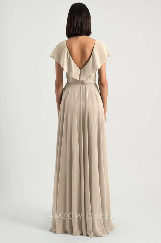 Elegante vestido cruzado de gasa beige Amzcw con escote en V profundo, mangas cortas con volantes, vestidos formales largos y fluidos.