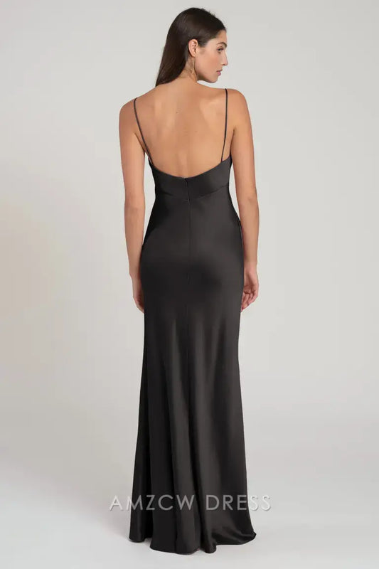 Vestido lencero elegante de satén negro con cuello vuelto de Amzcw - Vestidos formales largos ajustados con tirantes finos