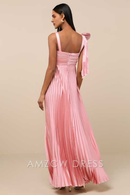 Vestido largo elegante y elegante con lazo, sin mangas, plisado y satén rosa, de Amzcw.