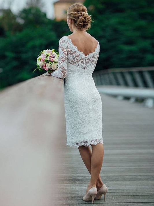 Vestidos de novia con escote tubo/columna, encaje, mangas largas y escote redondo hasta la rodilla